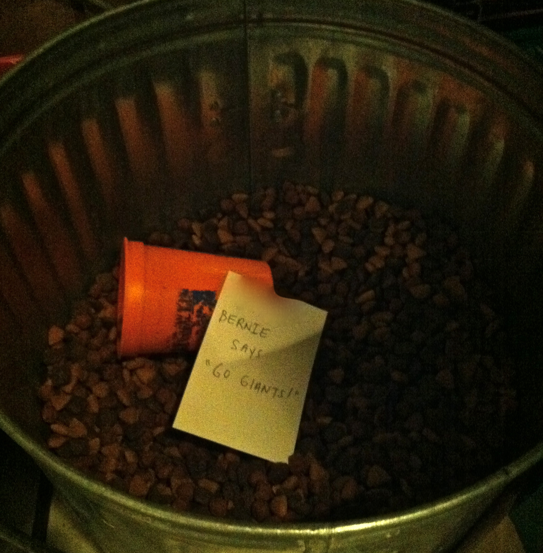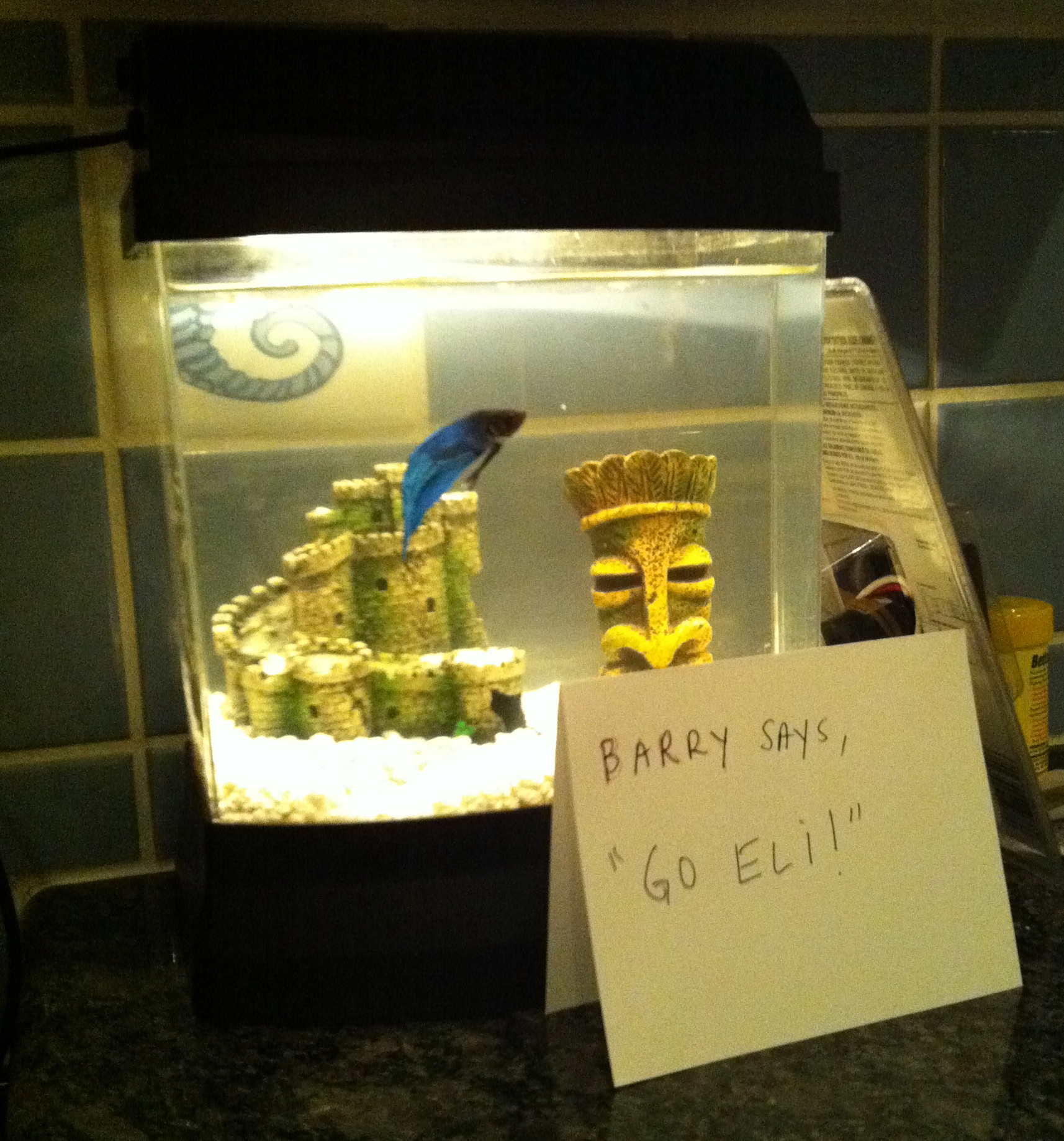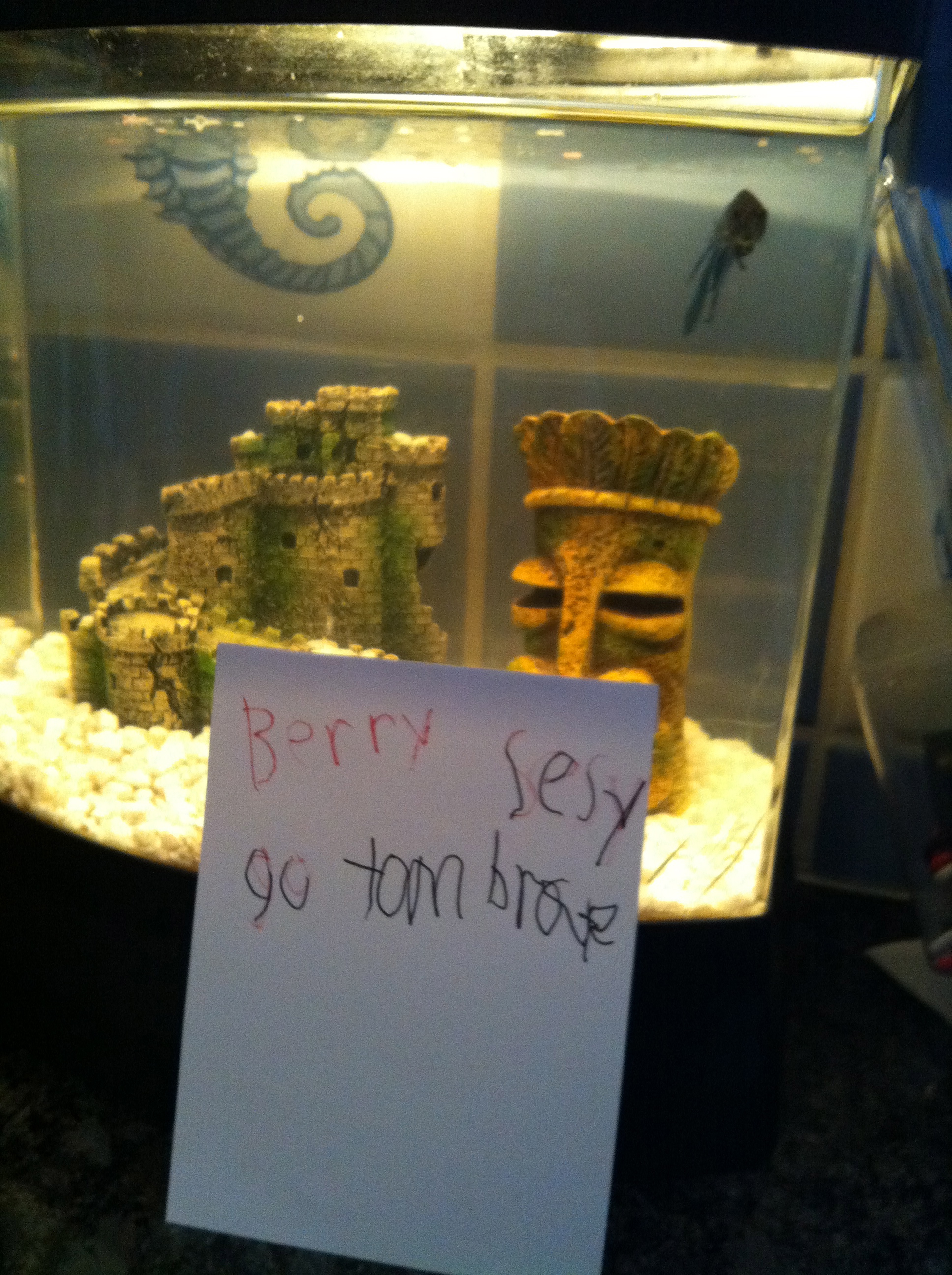 As I mentioned in my last post, we’ve got some family division going on with the Pats-Giants Superbowl. Again. Big Brother is Team Pats with me. Little Brother Team Gmen with Dad. Well, now that Big Brother can write, he and his Dad have been leaving notes around laying claim to which team has the most family support. The fish and the dog are now critical participants.