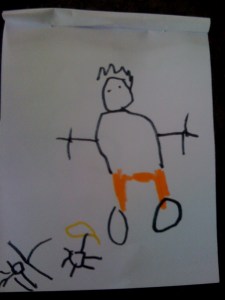 Big Brother drew a picture in school today of someone he kept referring to as “Fancy Pants”. His teachers, attempting to label his artwork for him, were likely taken aback. Perhaps they may have viewed “Fancy Pants” as a somewhat derogatory expression, seen the picture and pegged us as snobs. Or, thought that perhaps we make fun of people and use judgmental names in the presence of our children. Here’s Big Brother’s picture.